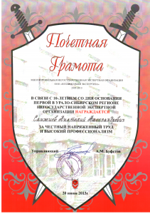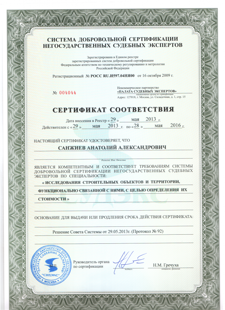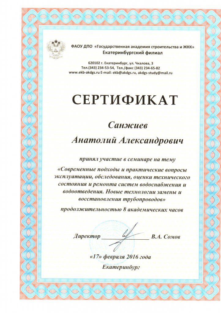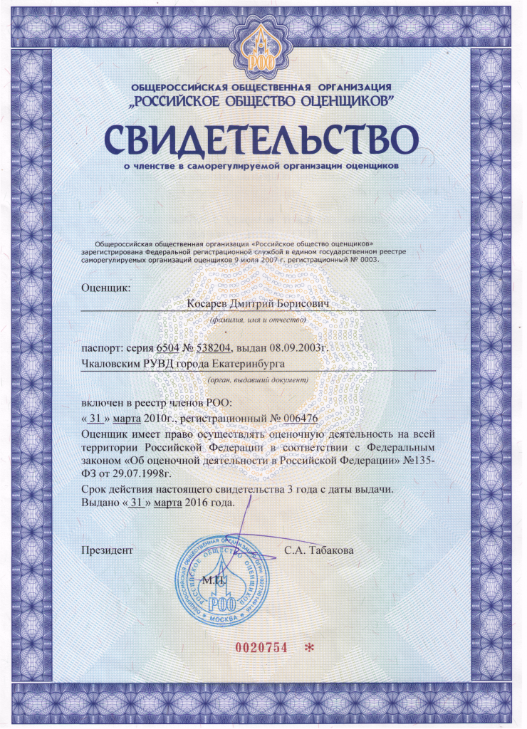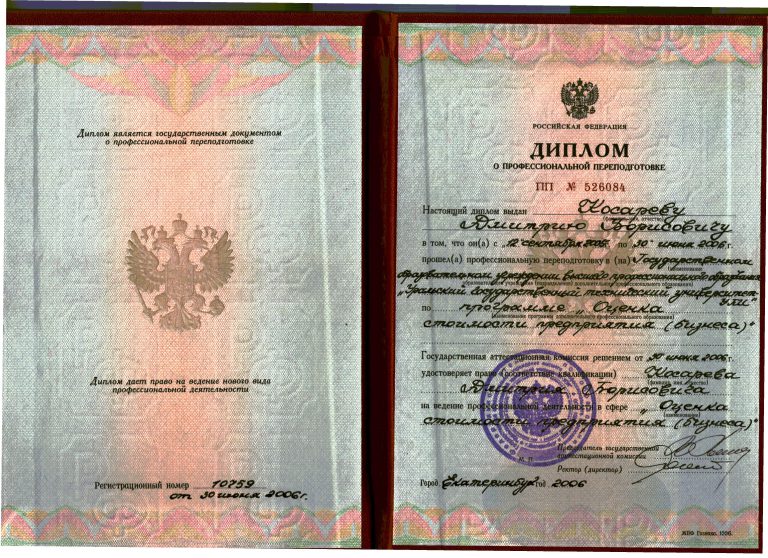 Эксперт по оценке имущества (недвижимого и движимого, в том числе имущественных прав, работ, услуг) Окончил программу «Оценка стоимости предприятия (бизнеса)». Диплом 240005496, регистрационный номер 164, выдан 28.06.2013 г. ФГБОУ ВПО «Уральский государственный экономический университет». Свидетельство о членстве СРОО «Экспертный совет».