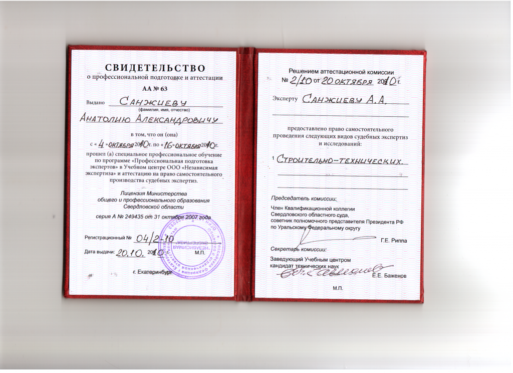 свидетельство о профессиональной подготовке и аттестации на право самостоятельного проведения судебных строительно-технических экспертиз АА № 63, выданное Учебным центром ООО «Независимая экспертиза» на основании лицензии Министерства общего и профессионального образования Свердловской области серия А № 249435 от 31.10.2007 г,