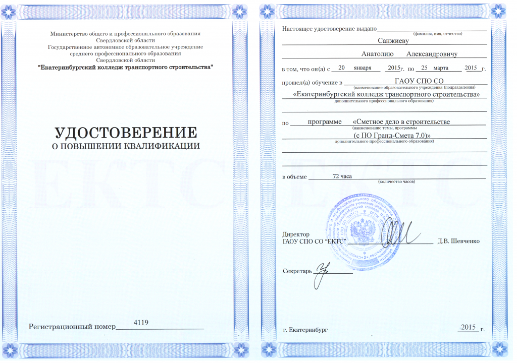 удостоверение о повышении квалификации по программе «Сметное дело в строительстве», регистрационный номер 4119.